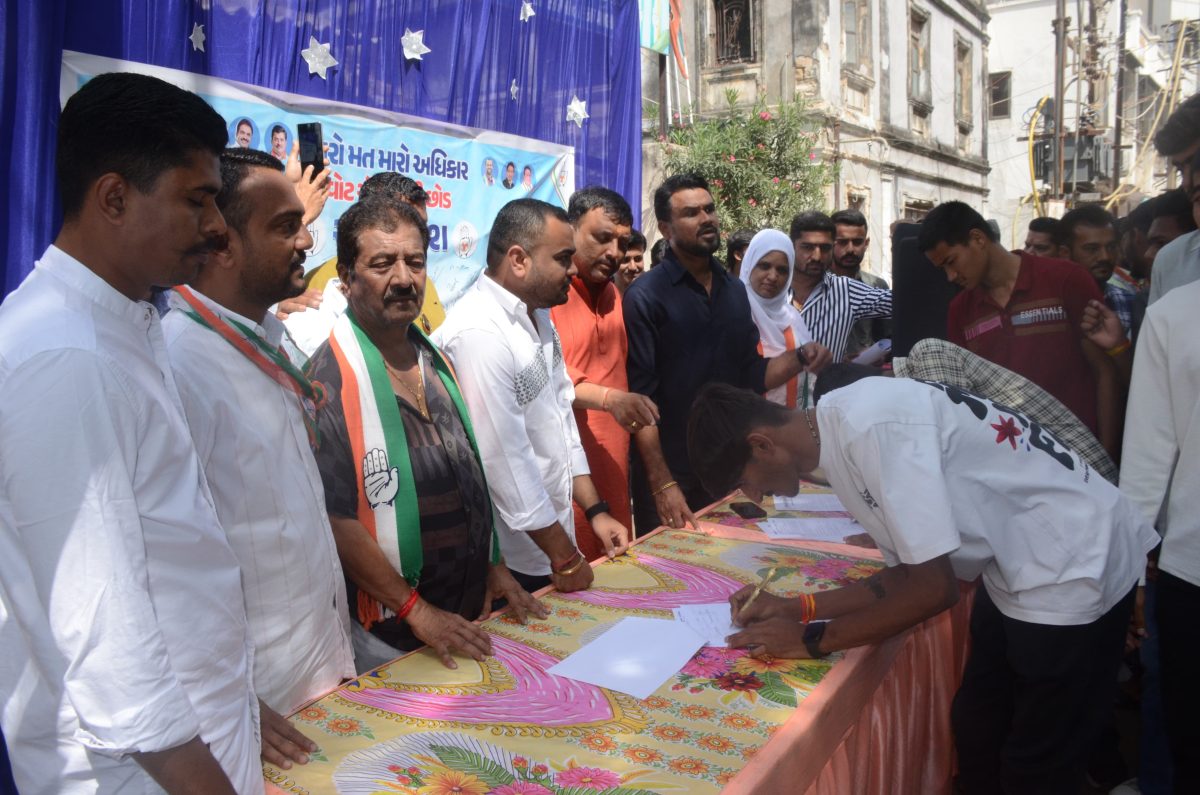 વોટચોર ગાદી છોડ” ગુજરાત યુવક કોંગ્રેસના સહી ઝુંબેશ કાર્યક્રમમાં ગતરોજ જામનગરમાં યોજાયેલા સહી ઝુંબેશમાં 1000 સહી કરીને ફોર્મ ભરવામાં આવ્યા હતા. આ કાર્યક્રમ હેઠળ સહી ઝુંબેશ કાર્યક્રમ ગુજરાત યુવક કૉંગ્રેસના પ્રમુખ હરપાલસિંહ ચુડાસમા, મહામંત્રી પ્રવીણભાઈ વણોલ, રવિભાઈ જીત્યા અને ઓલ ઈન્ડિયા યુવક કૉંગ્રેસ ના મંત્રી પવનભાઈ મજીઠીયાની આગેવાનીમાં સમગ્ર ગુજરાતની સાથે જામનગર ખાતે ગતરોજ યોજાયો હતો.જેમાં પૂર્વ સાંસદ વિક્રમ માડમ પણ હાજર રહ્યા હતા