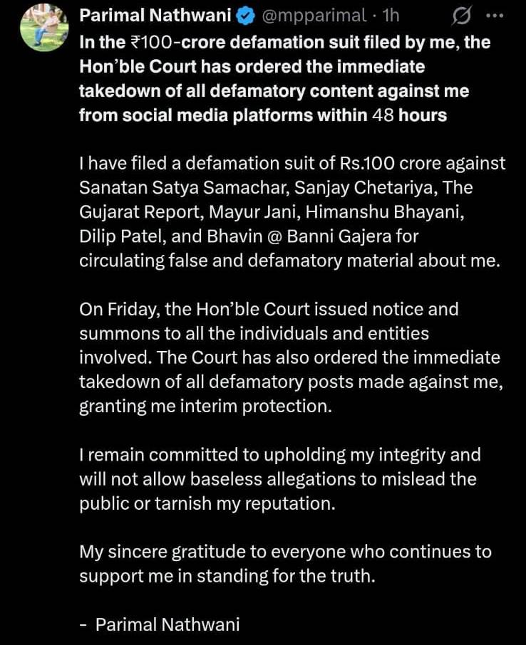 રાજયસભાના સાંસદ પરિમલભાઈ નથવાણીએ પોતાની ફેસબુક વોલ પર એક પોસ્ટ અપલોડ કરી છે જેમાં જણાવાયું છે કે, તેમણે રૂ. 100 કરોડનો માનહાનિનો એક દાવો દાખલ કર્યો છે, તેમાં અદાલતે તાત્કાલિક કાર્યવાહીઓના ભાગરૂપે જેમના દ્વારા બદનક્ષીજનક લખાણો,નિવેદનો જાહેર કરવામાં આવ્યા છે, તે લખાણો અને નિવેદનો 48 કલાકમાં હટાવી લેવાનો આદેશ કર્યો છે.