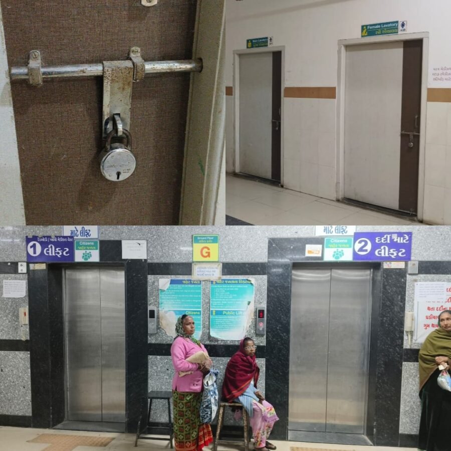 આ ઉપરાંત 9 માળની આ ઇમારતમાં દરેક માળે લોબીમાં દર્દીઓને મળવા આવતાં હજારો મુલાકાતીઓ માટે પુરૂષ સ્ત્રી શૌચાલય બ્લોક બનાવવામાં આવ્યા છે. જ્યાં એવું પણ લખાણ મૂકવામાં આવ્યું છે કે, મહિલા તબીબી સ્ટાફ માટેના શૌચાલય બ્લોક. દરેક માળે આ શૌચાલય બ્લોકને તાળાં છે ! દરરોજ હજારો મુલાકાતીઓએ વોર્ડમાં દર્દીઓ માટેના શૌચાલય બ્લોકનો ઉપયોગ કરવો પડી રહ્યો છે, જેને કારણે સેંકડો દર્દીઓને હાલાકીઓ વેઠવી પડી રહી છે.